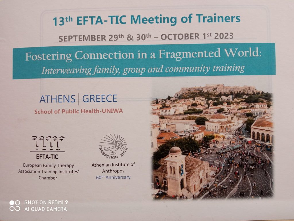 Nedavno održani sastanak trenera sistemske obiteljske psihoterapije u Ateni, u organizaciji Komore trening instituta Europske asocijacije za obiteljsku terapiju (EFTA-TIC), bio je prilika da zajedno s kolegama učimo, razmjenjujemo nove ideje, povezujemo se i proširujemo suradnju i sistemske perspektive. Hvala našim domaćinima na gostoljubivosti. Veselimo se idućem susretu!
